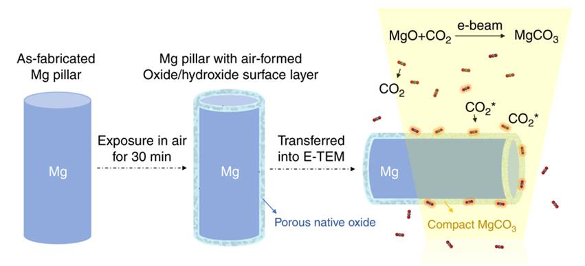 在单智伟教授的指导下,王悦存博士利用电子束辐照技术,成功地让二氧化碳在室温下与镁合金表面的原生氧化层或腐蚀产物发生反应,生成一层致密、牢固的纳米级碳酸镁层。实验测试表明,这种纳米膜可使测试样品的腐蚀电流降低约三个数量级,自腐蚀电位降低约一倍。与此同时,长有这种纳米膜的微纳尺度样品的屈服强度提升了近两倍,连续变形能力提升了五倍,抗氧化温度提升了200℃。这种方法简单易行、绿色环保,为新型耐腐蚀镁合金的研制提供了全新的技术思路。